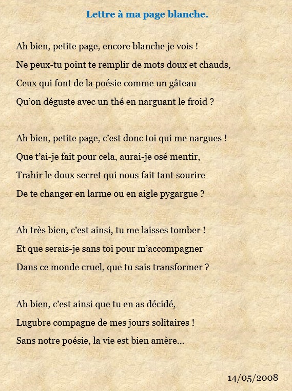 J'ai replongé dans mon dossier "poésie", que j'ai à peine touché depuis 2008. Des poèmes en attente de lecture... La majorité sont à jeter, j'étais déjà sur le déclin, mais il y en a quelques uns qui valent le détour. Celui-là a un rythme qui me plaît. Il faut dire que je retourne vers l'alexandrin, après l'avoir boudé toute ma jeunesse car je le trouvais trop long et trop lourd.